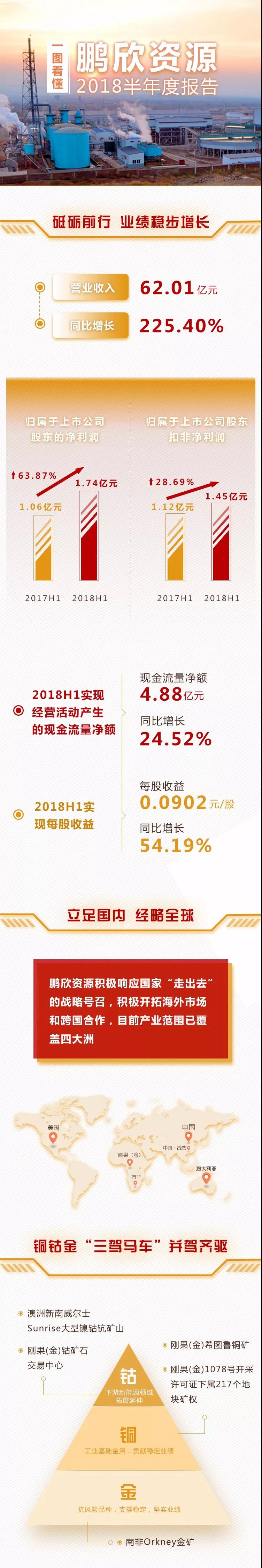 8月29日晚间,鹏欣资源发布了2018年度半年报,营收与净利均较去年同期实现了增长,其中公司实现归属于上市公司股东的净利润 1.74 亿元人民币,同比增加 63.87%。想了解更多亮点?下图让您一目了然: