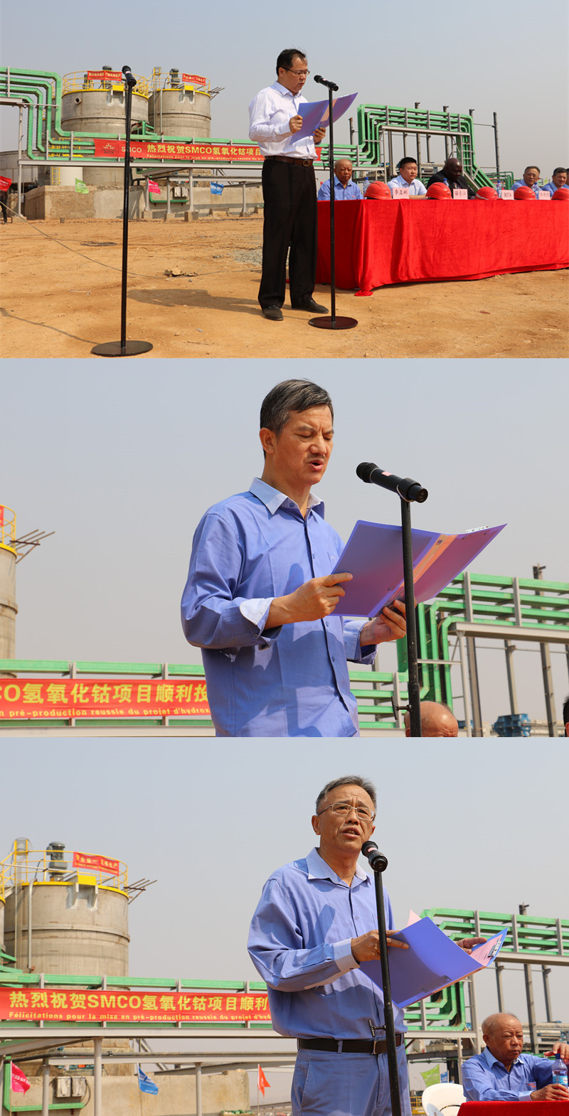竣工仪式上,鹏欣资源总经理助理朱晓伟先生代表鹏欣集团、鹏欣资源向氢氧化钴项目顺利竣工表示祝贺,并向参与建设的各方代表表示衷心感谢和亲切问候。SMCO常务副总、项目建设总负责人俞胜汉先生表示,本次一期项目的如期竣工,彰显了鹏欣在工程建设方面的超强实力,SMCO将再接再厉,确保下阶段顺利试生产。鹏欣资源总经理兼SMCO总经理何寅先生在发言中指出,本期工程的顺利竣工,为鹏欣资源主营业务发展成为铜、钴、金“三驾马车”并驾齐驱的局面奠定了扎实的基础,昭示着鹏欣资源朝着“全球领先的综合资源供应商”这一企业愿景又迈出了坚实的一步。