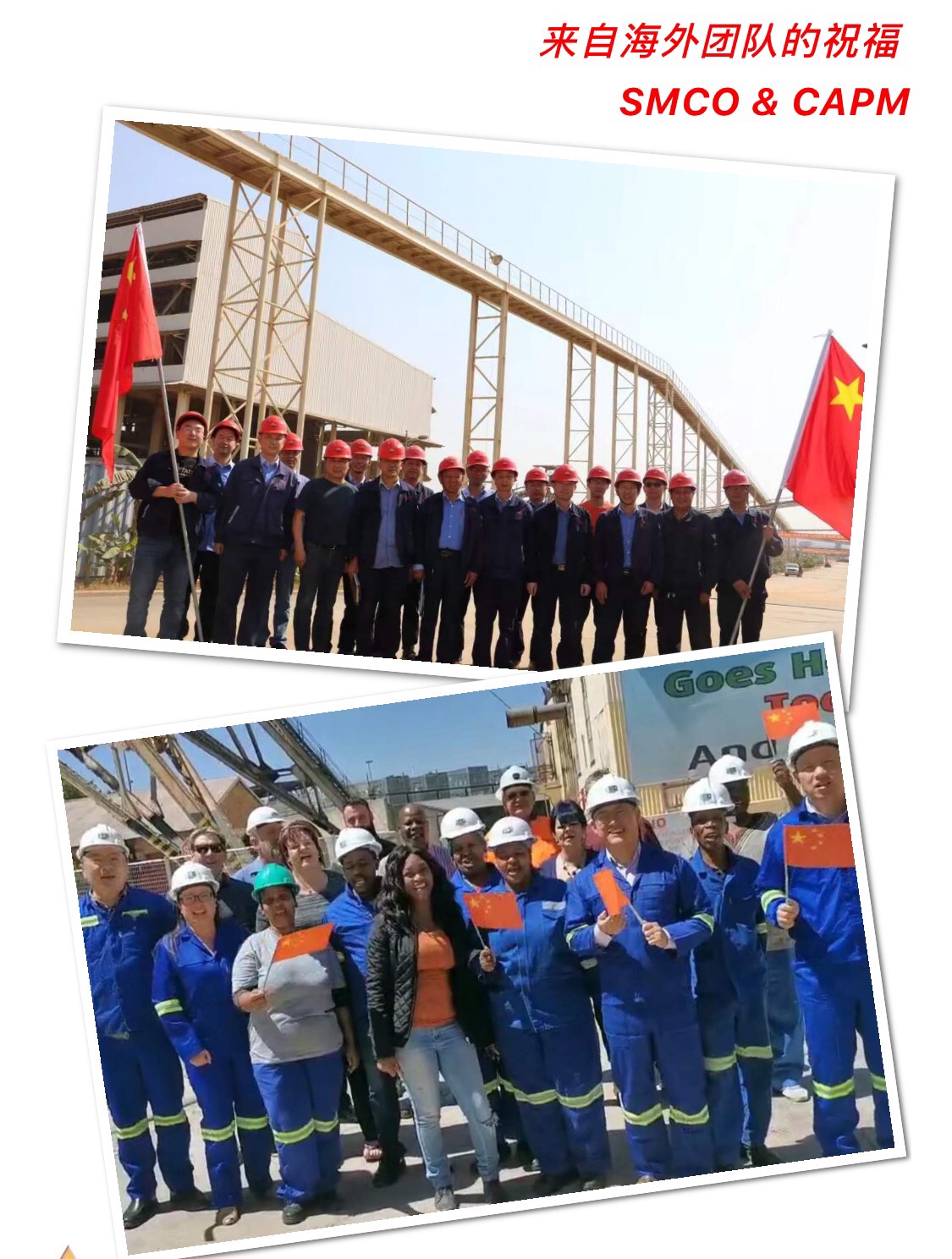 远在非洲的海外平台SMCO/CAPM也同样充满着浓浓的国庆气氛,坚守一线的员工为祖国的繁荣发展感到骄傲,一同为祖国的繁荣富强高歌!