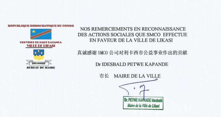 近日,刚果(金)加丹加省利卡西市市长 IDESBALD PETWE先生亲笔签发了表彰信,真诚感谢鹏欣资源旗下SMCO(希图鲁矿业股份有限公司)多年来对利卡西市公益事业做出的杰出贡献。