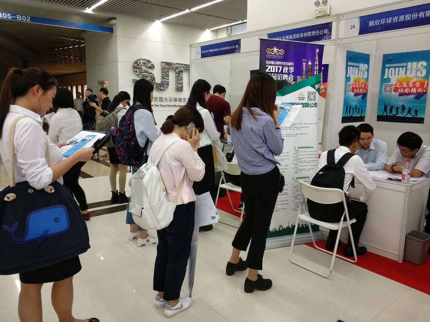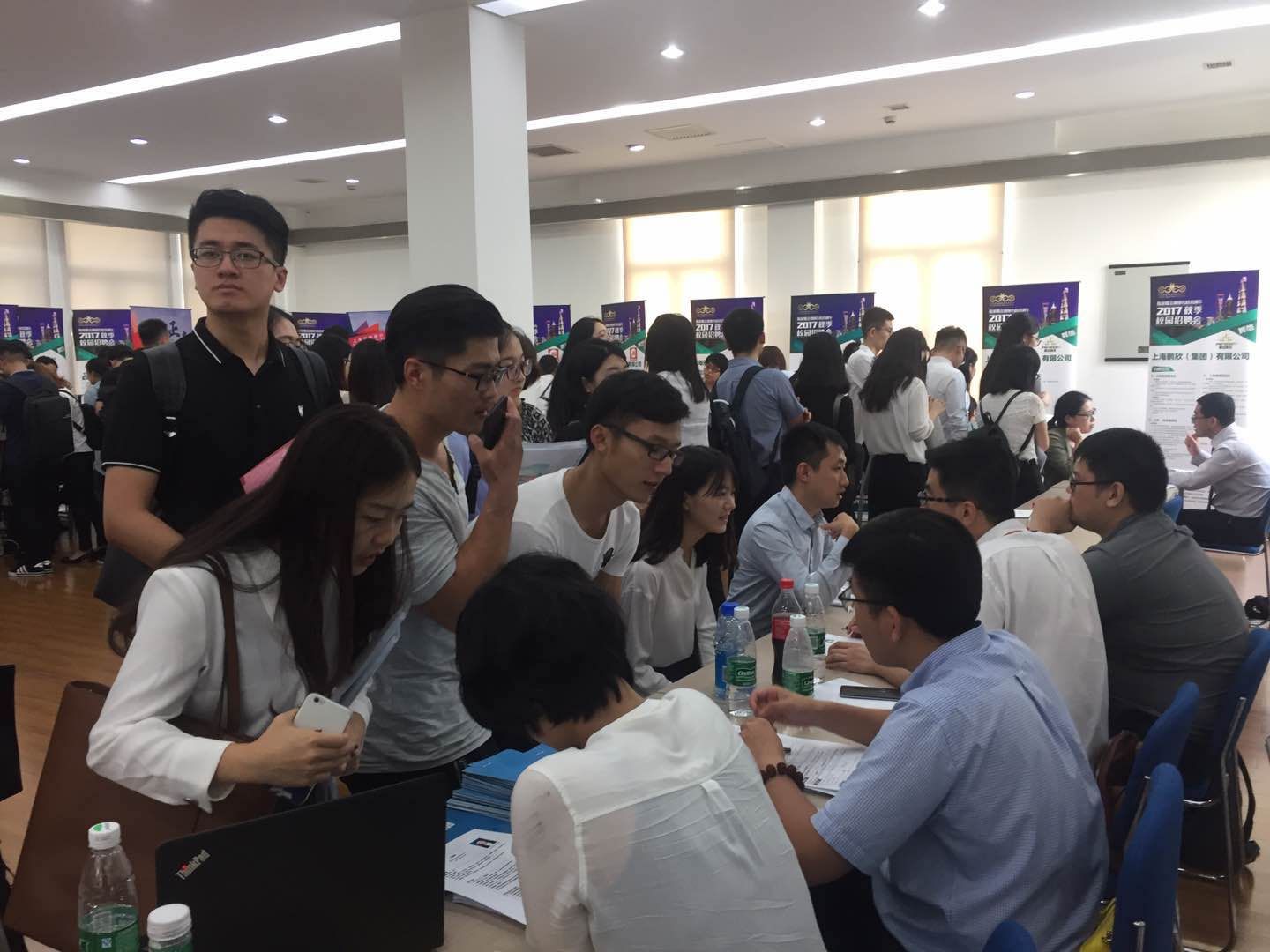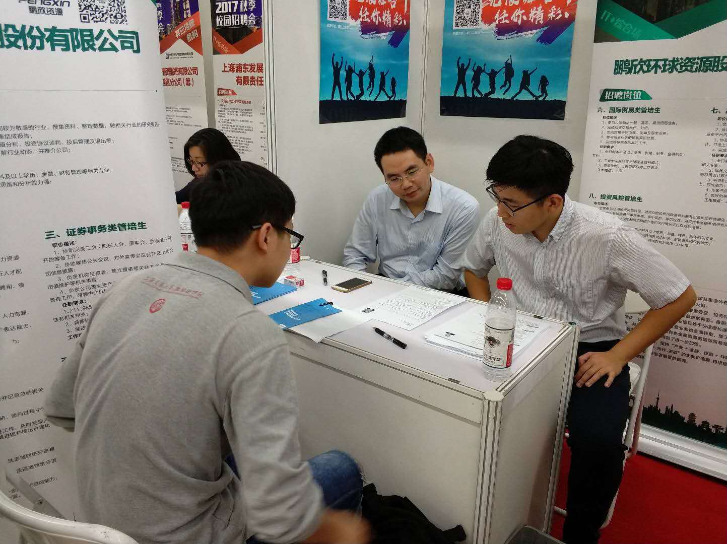 上海财经大学,鹏欣资源的校招工作区域吸引了众多同学的关注,桌上的简历早已堆起厚厚一叠。
