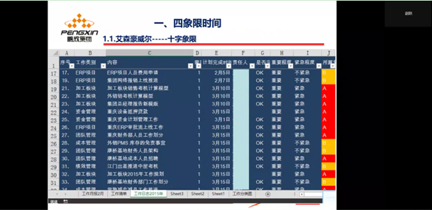 分享会上,公司部门员工代表结合课程内容及实际工作情况,分享了自己对于时间管理的理解。其中,合规审计部陆康明分享了自己的观点,他表示想要高效的管理时间,首先要成为自律的人;生态部王善修则为我们明确了时间管理的本质,并非时间而是事项、专注力和习惯;生态部刘行则带来了提高工作效率的三个重要点,即明确目标要事第一、坚持21法则、保持正念持续反思;规划运营部赵跃结合自身在时间管理方面的经验,分享了5w1H法、鱼骨分析法、思维导图法这几个结构性解决问题的方法。分享会现场干货满满,另还有计划财务部、人事行政部、贸易部的同事都积极参与到此次分享会中,一一分享了他们对于时间管理的理解及心得。