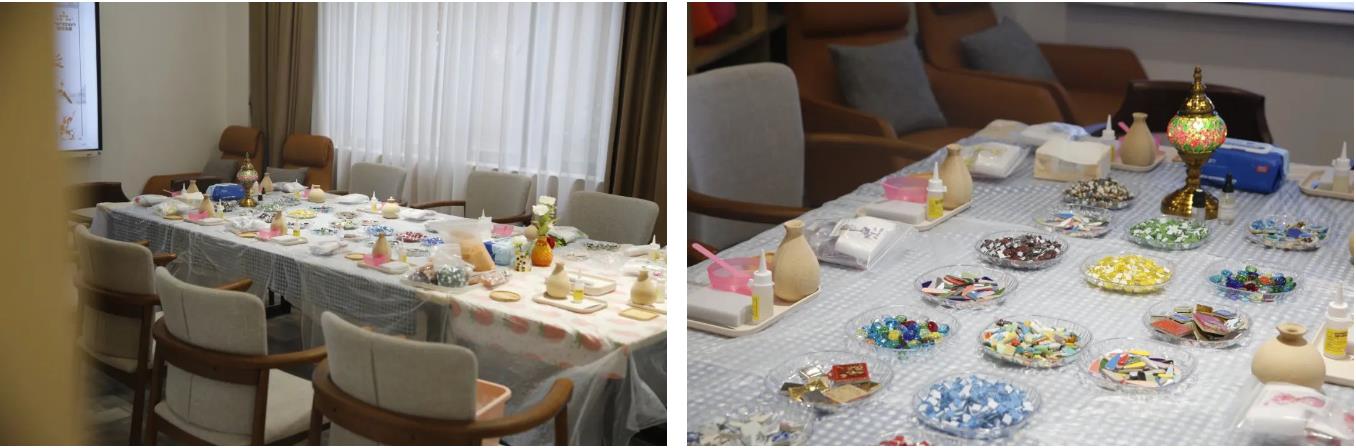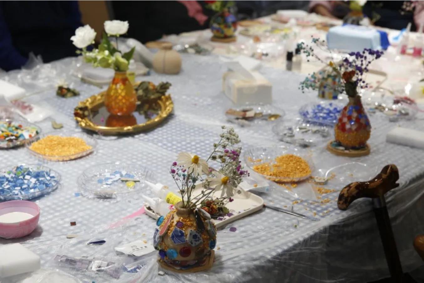 当日下午,淮海中路长者照护之家的老人们围坐在一起,开启了这场主题为“共筑温馨、让爱绽放”的手工DIY艺术花瓶活动。原本安静的长照之家瞬间充满了欢声笑语。五颜六色的马赛克在大家手中巧妙地组合,经过构思、设计、粘贴,一个个独具匠心的花瓶逐渐成型。