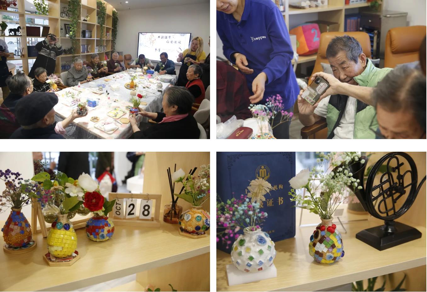 参与本次活动的是一群80+90+的可爱老人,平均年龄达到了87岁高龄。对他们而言,本次活动不仅是一次手工制作的过程,更是心灵之间的交流与碰撞。大家沉浸在创作的乐趣中,眼中闪烁着光芒,仿佛找回了久违的童真。这些亲手制作的花瓶,承载着满满的关爱与温暖,成为了这个深秋里最温馨的点缀。